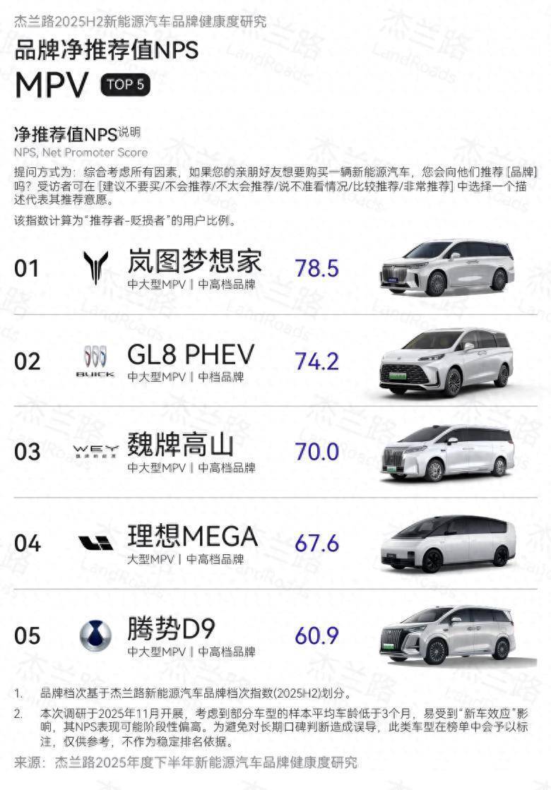 高端新能源MPV市集的竞争,已从销量竞赛蔓延至用户赤忱度的深层较量。最新数据清晰,2026款岚图梦思家以78.5%的净推选值(NPS),在新能源MPV品类中位居榜首。这意味着每10位车主中,有近8位欢畅主动向亲一又推选,其口碑大叫力可见一斑。