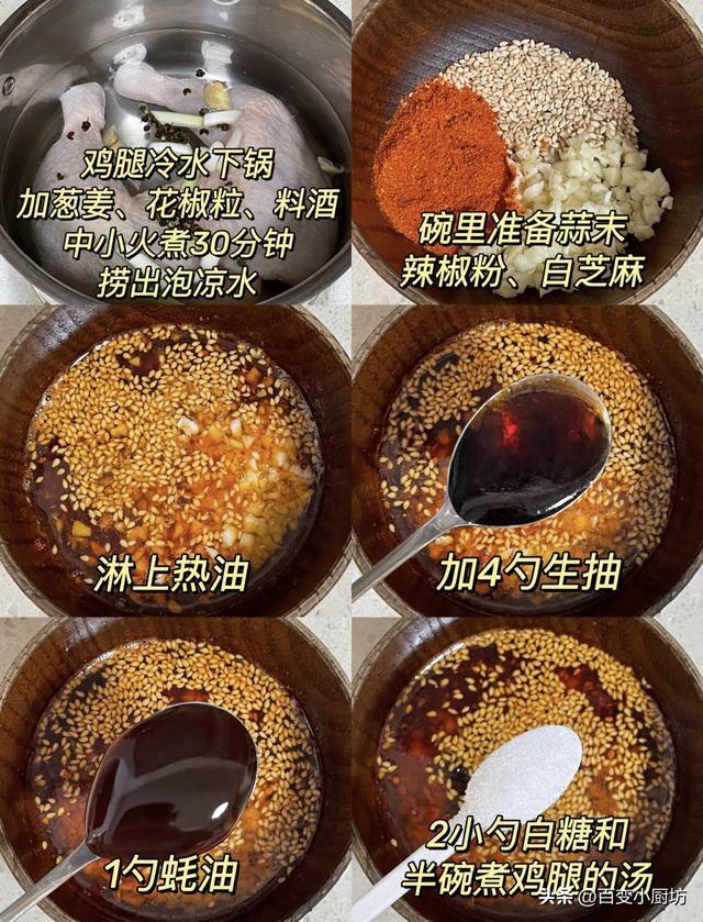 - 红油调料:辣椒面2勺、花椒1勺、菜籽油100ml、生抽2勺、香醋1勺、白糖半勺、盐极少、香油1勺