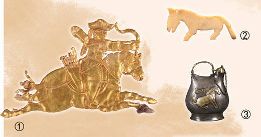 图①:青海齐兰沸水墓群2018血渭一号墓出土骑射形金饰片。 图②:河南安阳殷墟妇好墓出土玉马。 图③:陕西西安南郊何家村出土唐舞马衔杯纹银壶。