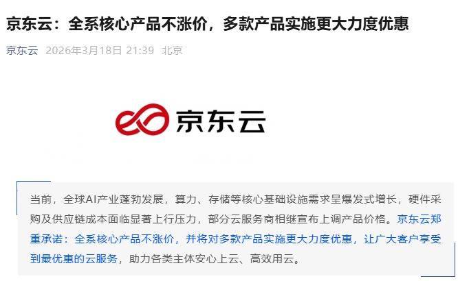 【大河财立方音信】3月18日晚间,京东云发文,欢跃全系中枢居品不加价,并将对多款居品实行更鼎力度优惠,助力千般主体宽心上云、高效劳云。